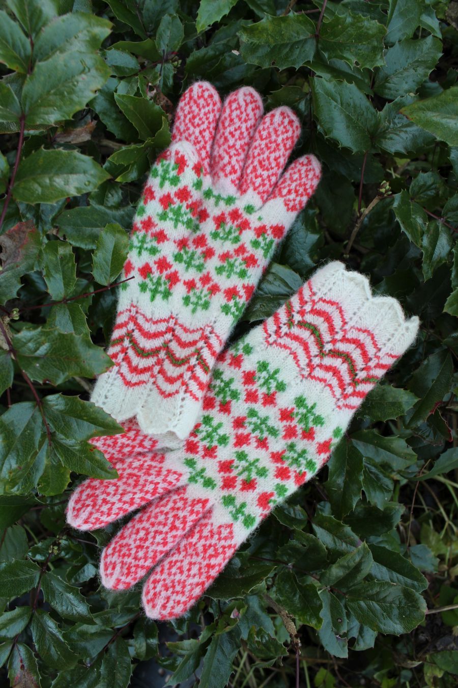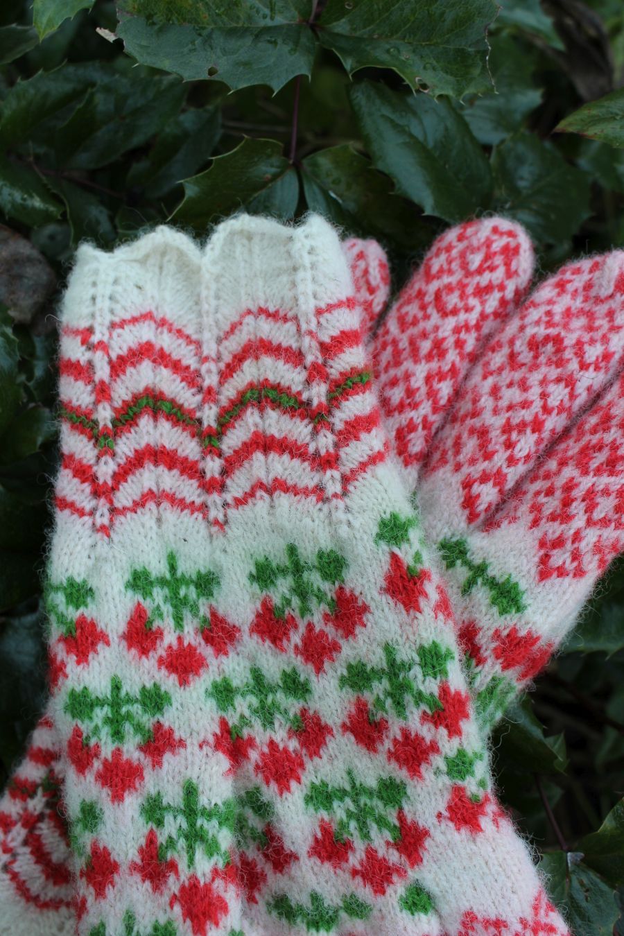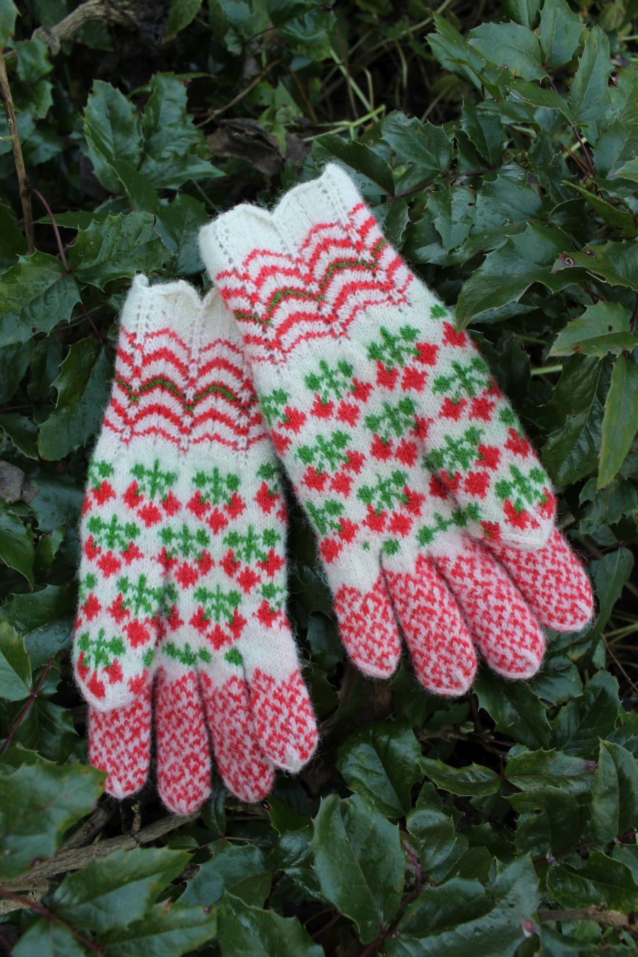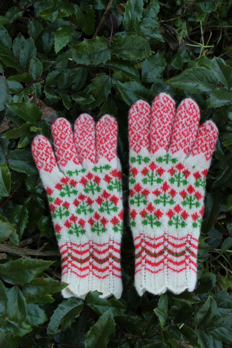 Tightly knitted using 0-size needles and DK weight yarn. The red and green yarns are hand dyed, 100% Estonian wool. The white yarn is natural sheep color from Estonia. They are perfect to block wind and wear in winter. The cuff is finely lacy.