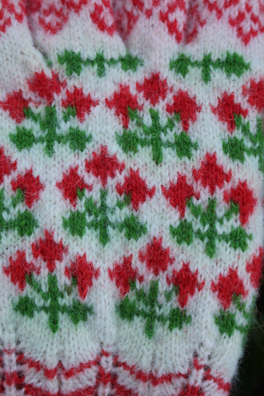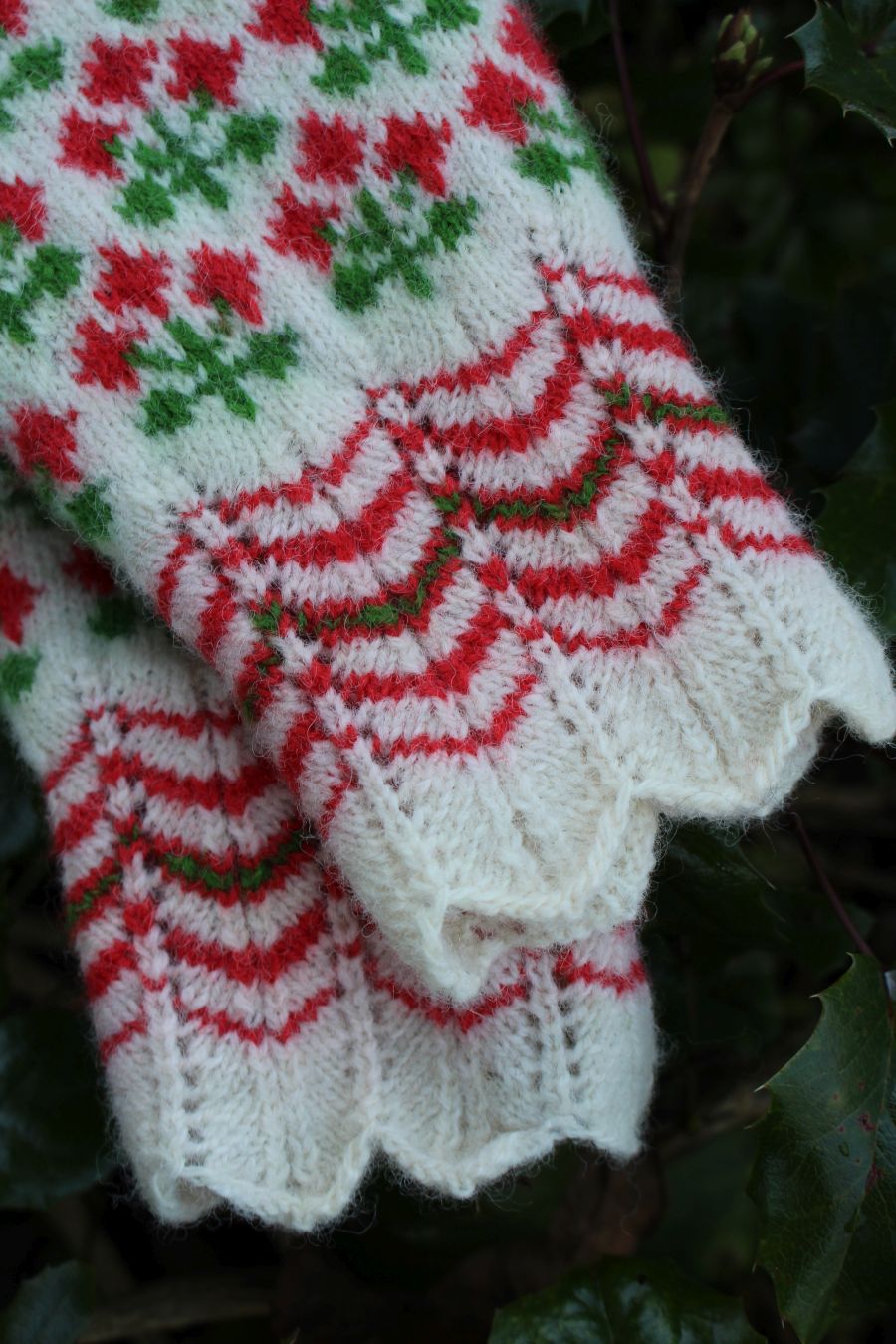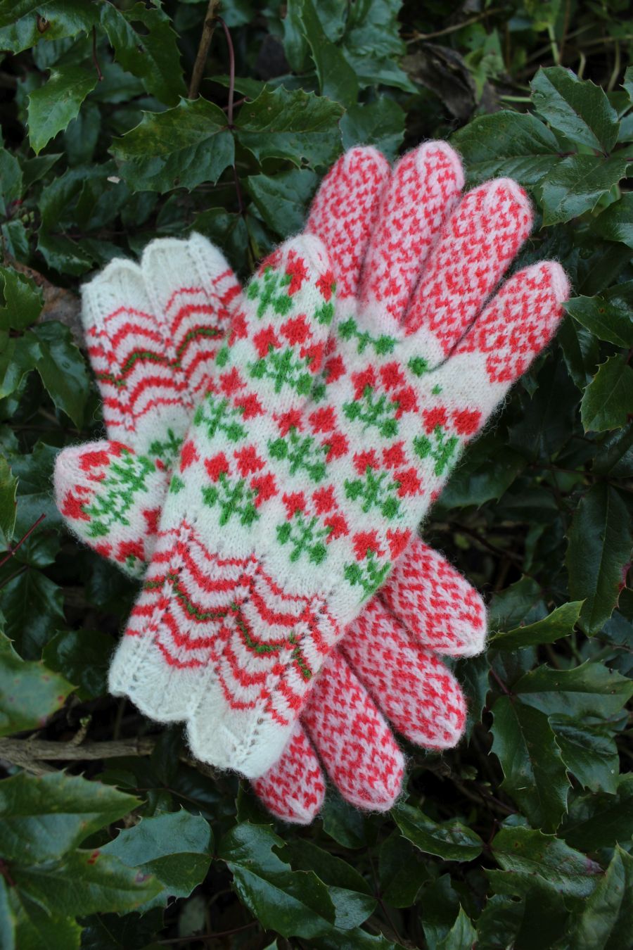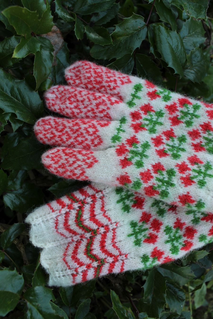 Tightly knitted using 0-size needles and DK weight yarn. The red and green yarns are hand dyed, 100% Estonian wool. The white yarn is natural sheep color from Estonia. They are perfect to block wind and wear in winter. The cuff is finely lacy.