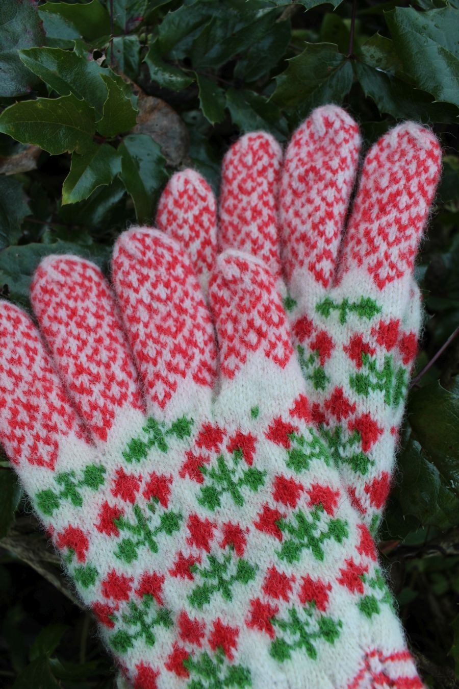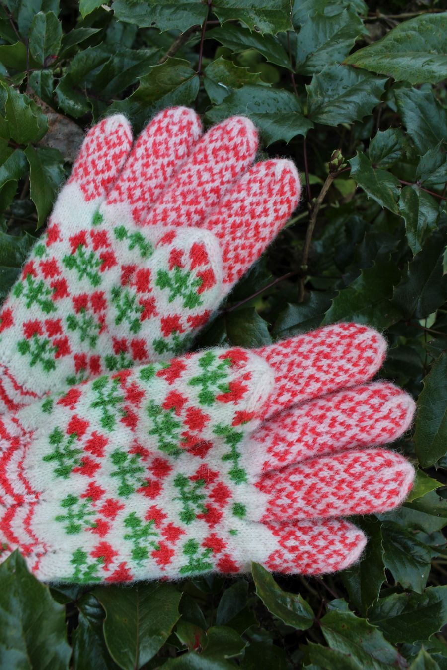 The gloves are color-worked all the way to the fingertips, which makes them warmer than average thin one-layer gloves. The yarn being rather thin makes them very comfortable to wear and they fit like a second skin.