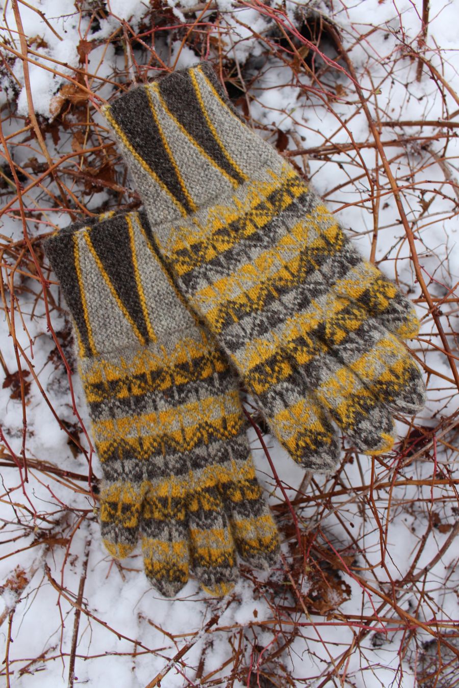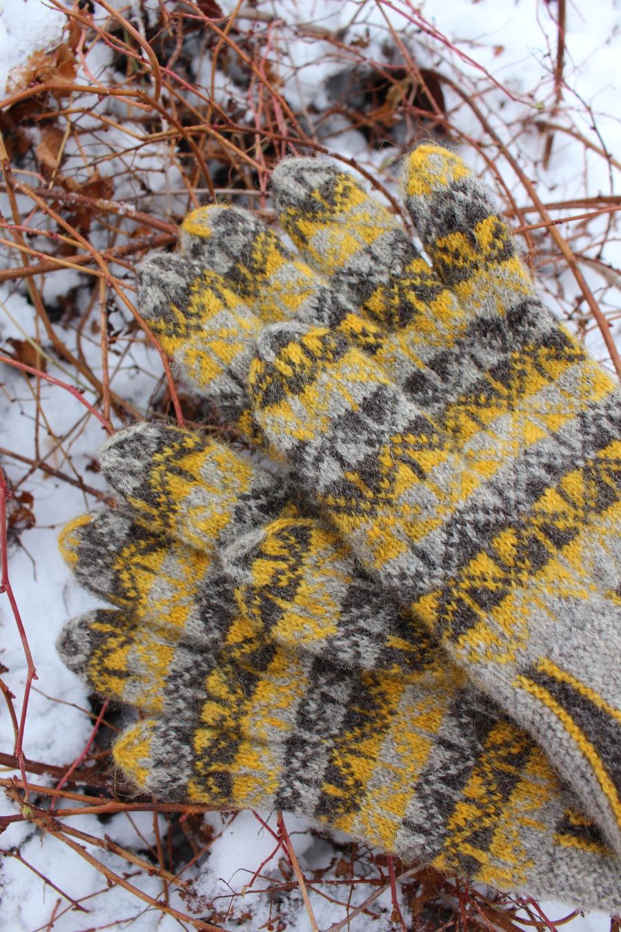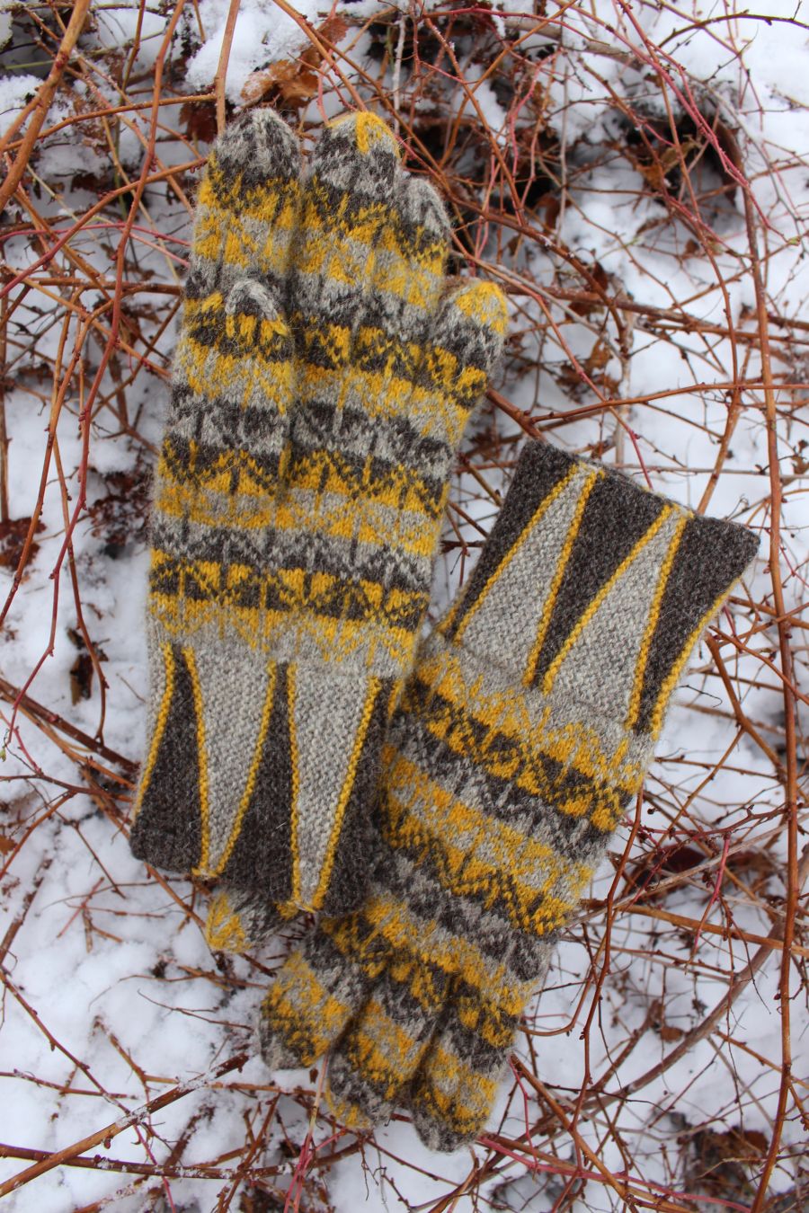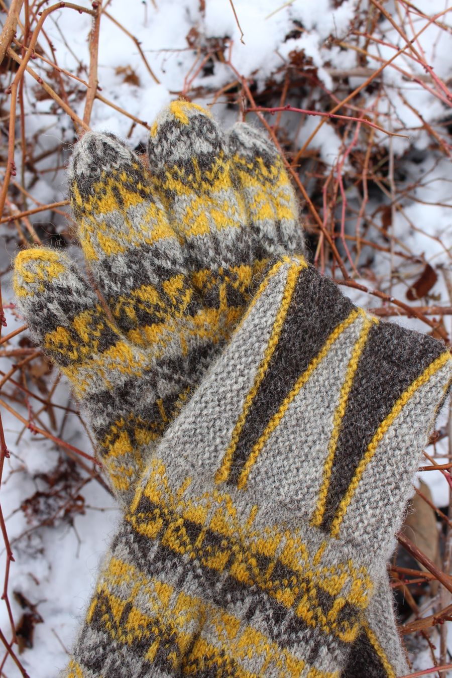 Knitted with three colored yarn – yellow, grey and brown – in traditional Estonian fair-isle style. The yellow yarn is hand dyed, the grey and brown are natural sheep color, 100% wool from Kihnu Island, Estonia. Tightly knitted using 0-size needles and DK-weight yarn, they are perfect to block wind and wear in winter.