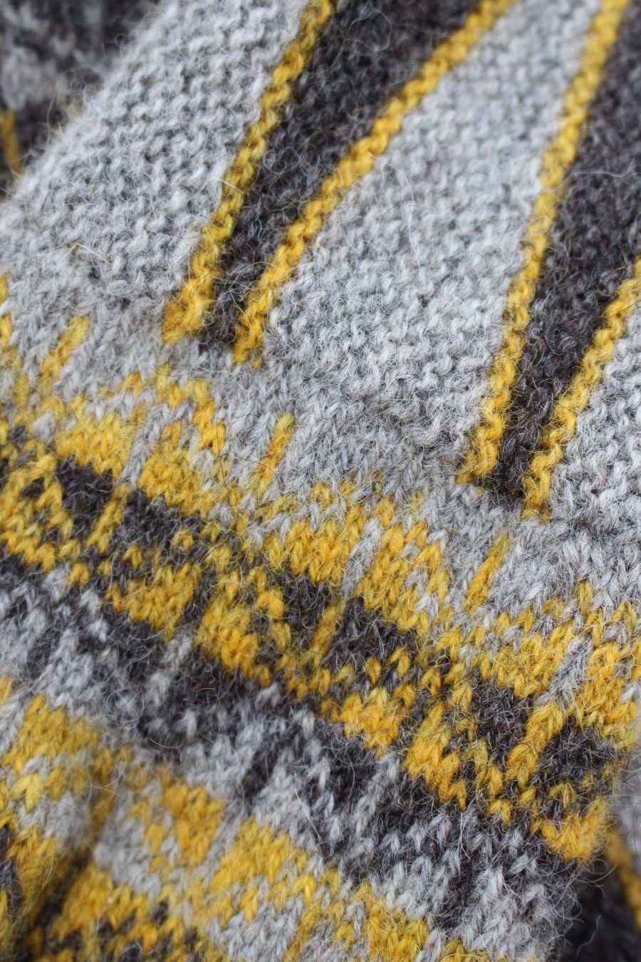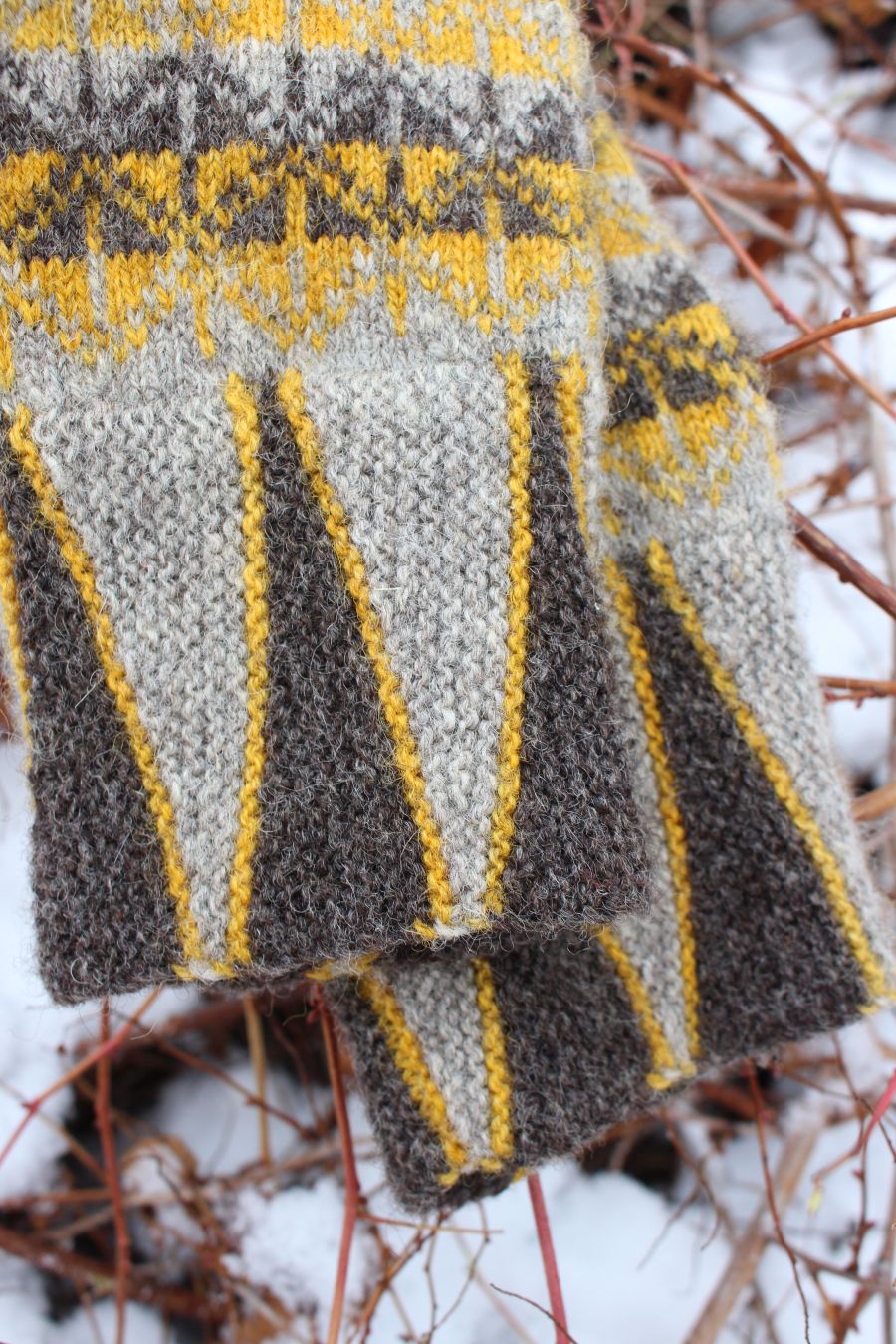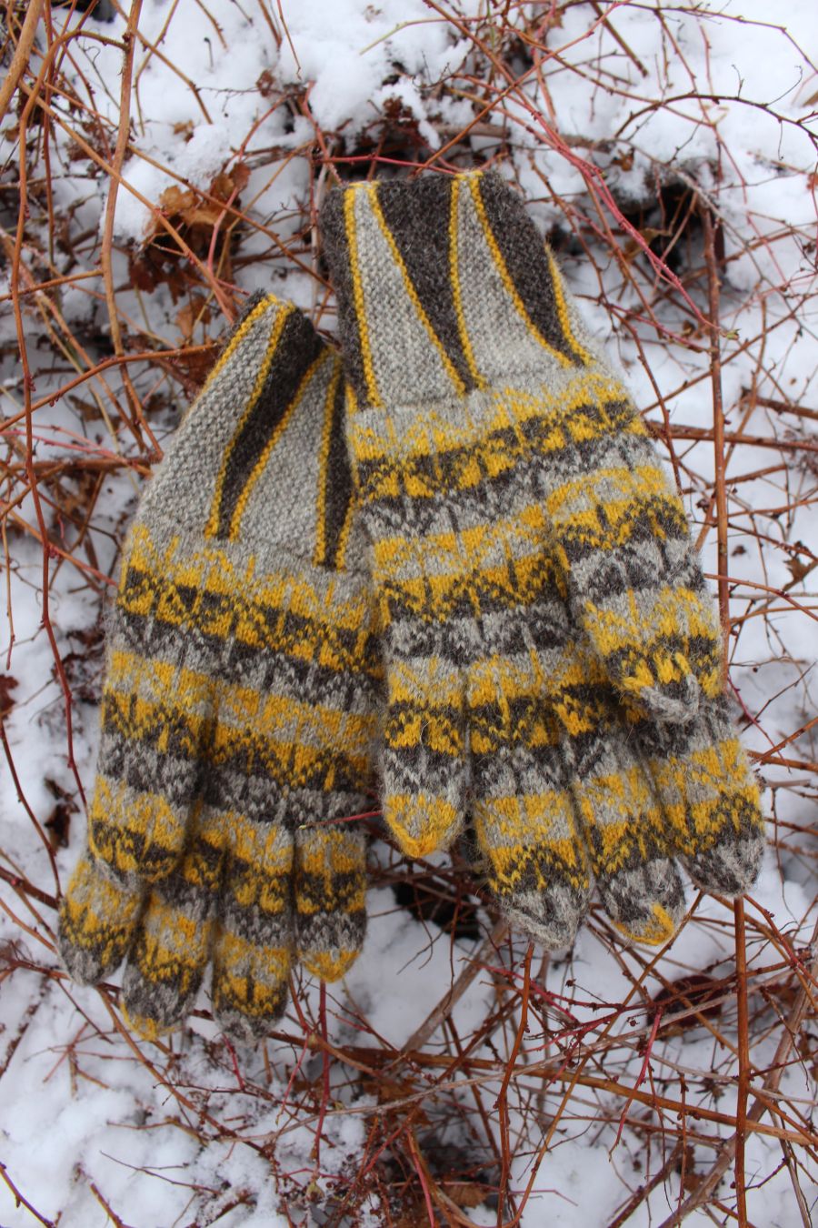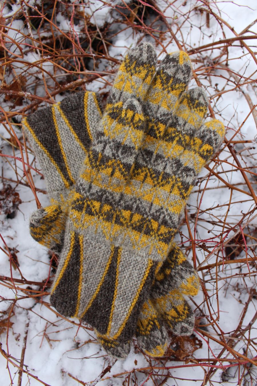 Knitted with three colored yarn – yellow, grey and brown – in traditional Estonian fair-isle style. The yellow yarn is hand dyed, the grey and brown are natural sheep color, 100% wool from Kihnu Island, Estonia. Tightly knitted using 0-size needles and DK-weight yarn, they are perfect to block wind and wear in winter.