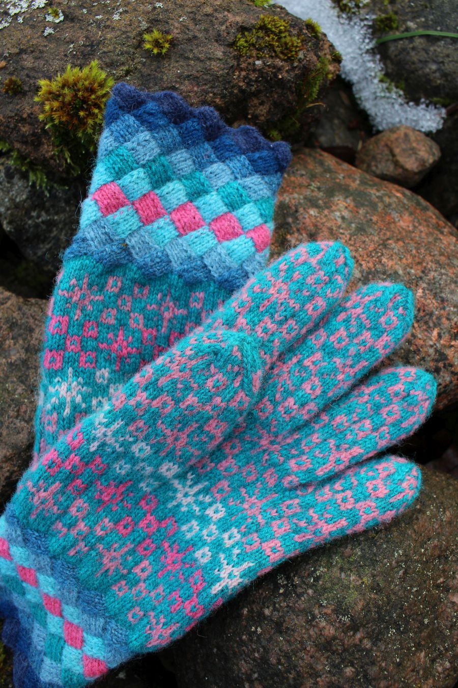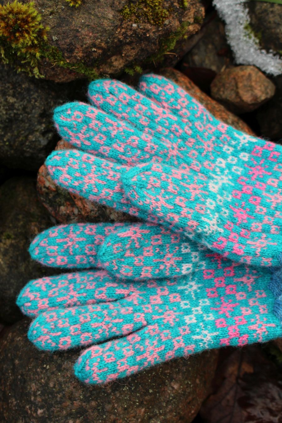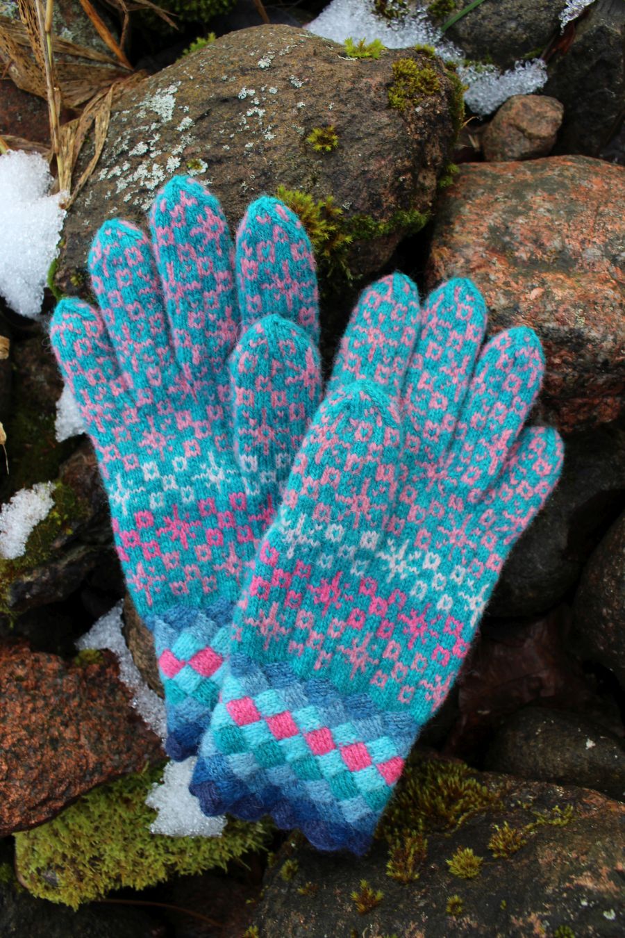 Knitted with more than three colored yarn – turquoise, pink, coral, magenta – in traditional Estonian fair-isle style. All the yarns are hand dyed, 100% wool from Estonia. Tightly knitted using 0-size needles and DK-weight yarn, they are perfect to block wind and wear in winter.