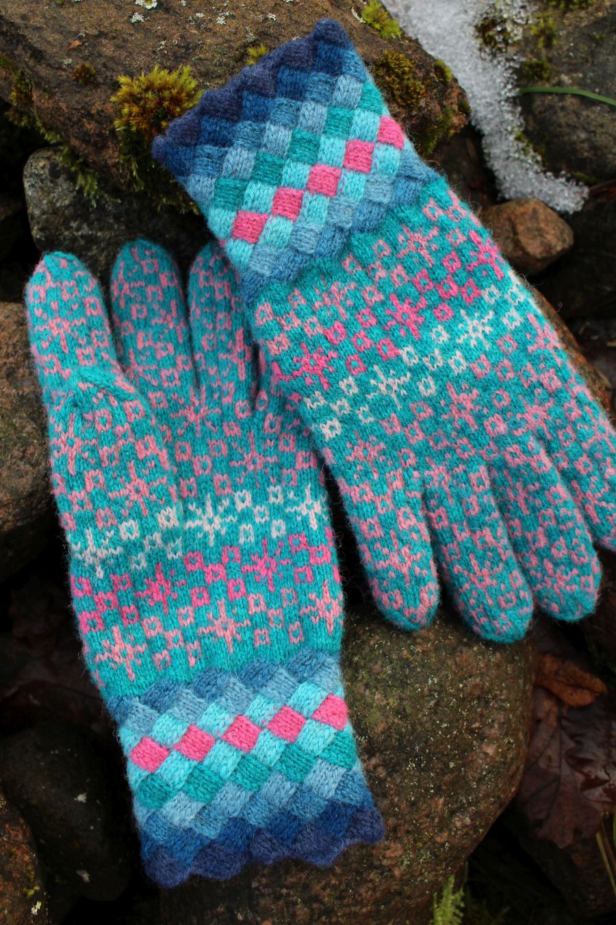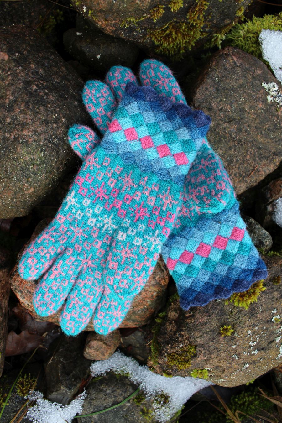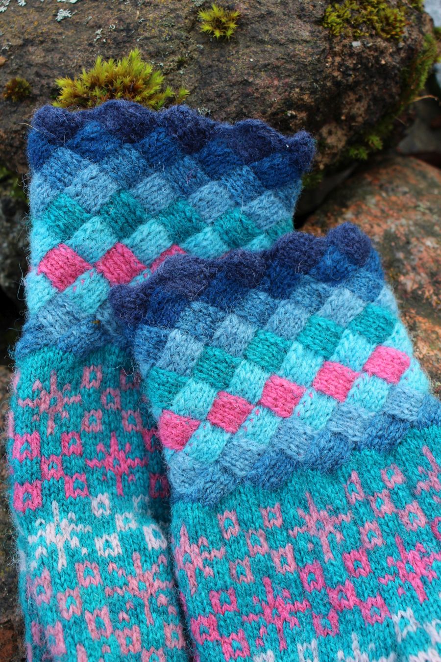 Knitted with more than three colored yarn – turquoise, pink, coral, magenta – in traditional Estonian fair-isle style. All the yarns are hand dyed, 100% wool from Estonia. Tightly knitted using 0-size needles and DK-weight yarn, they are perfect to block wind and wear in winter.