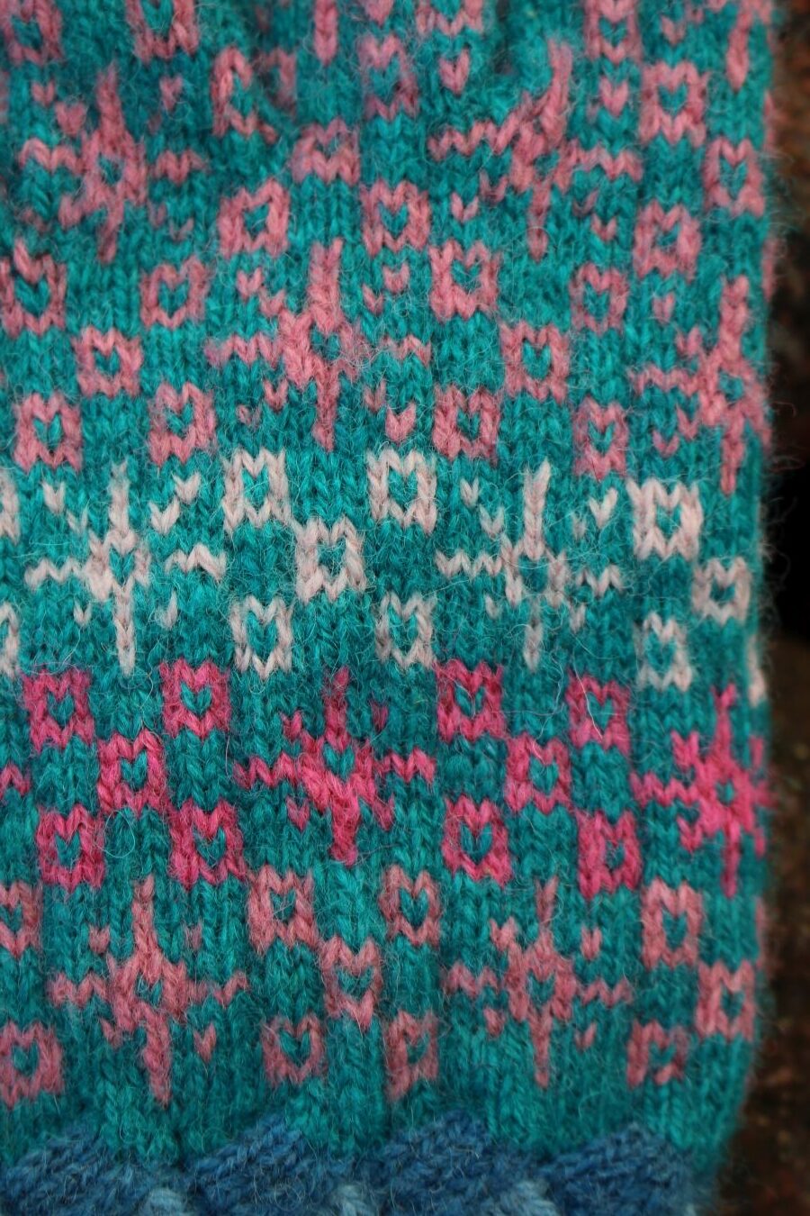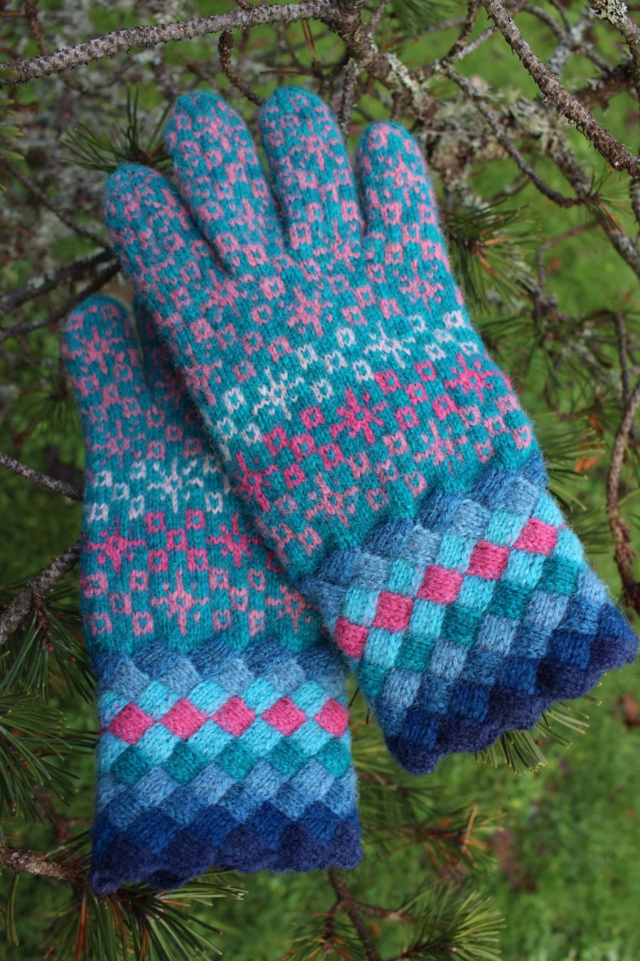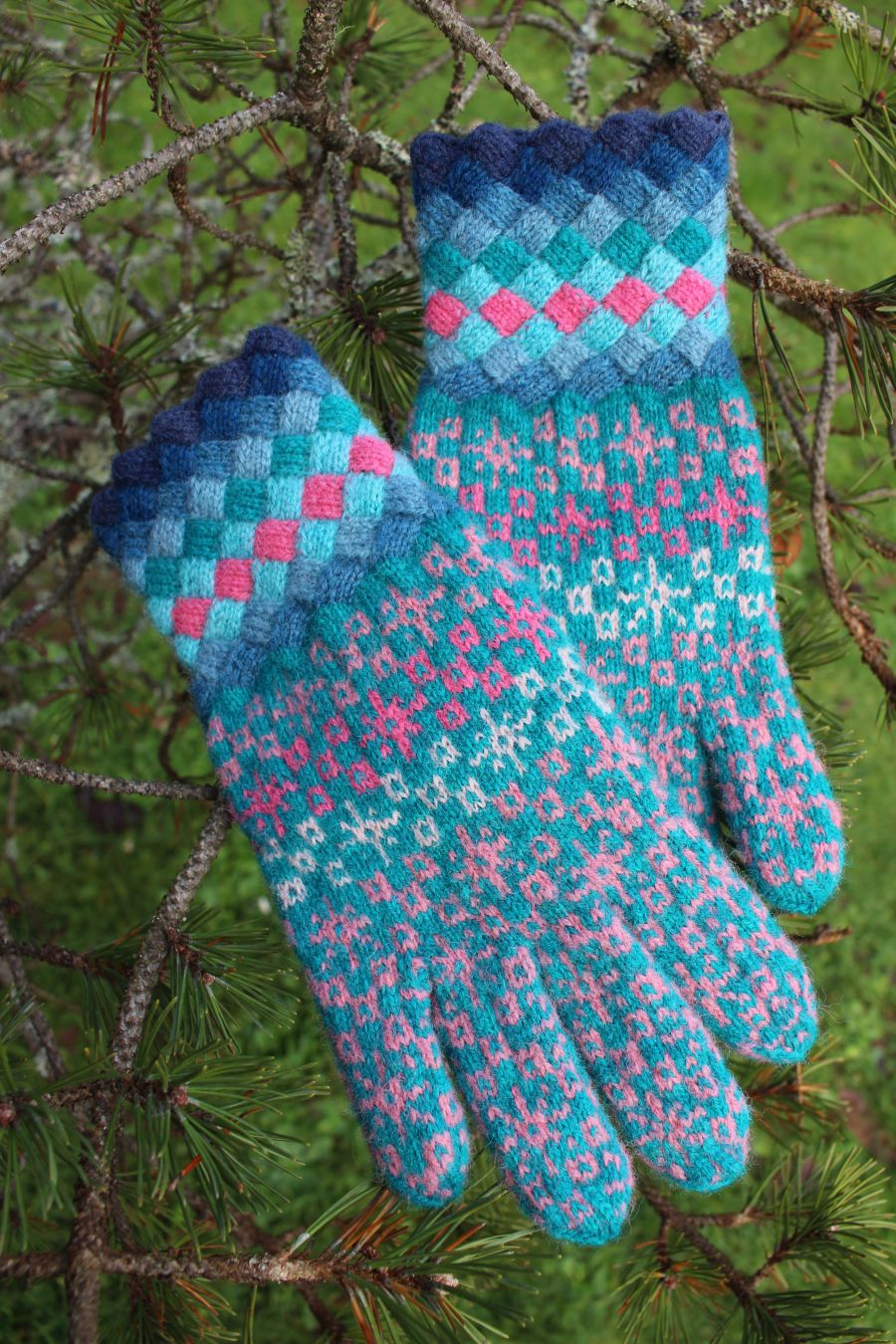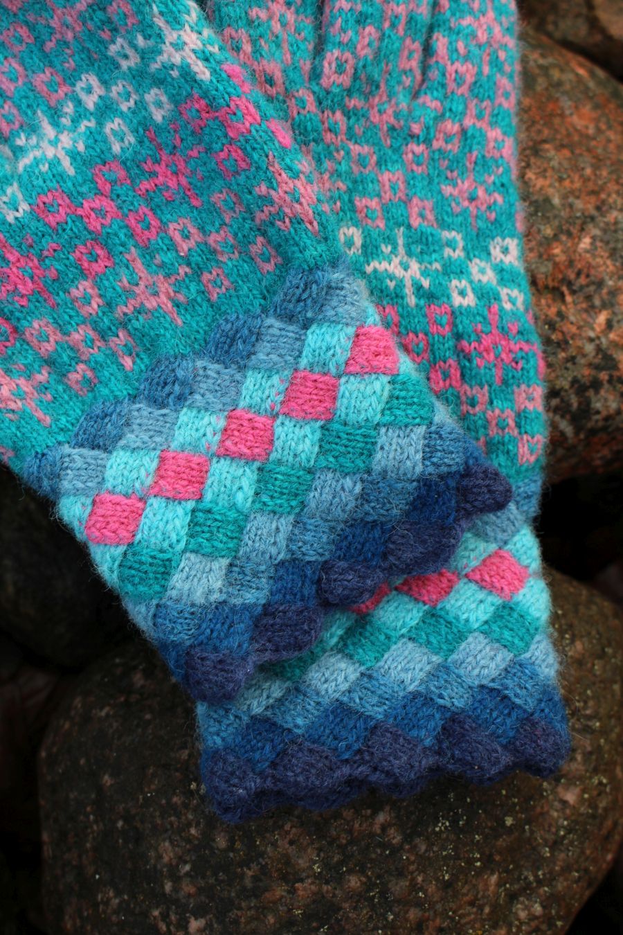 This pattern comes from Pärnu County, Estonia. The cuff is knitted colorfully using the entralac style and matching colors of blues.