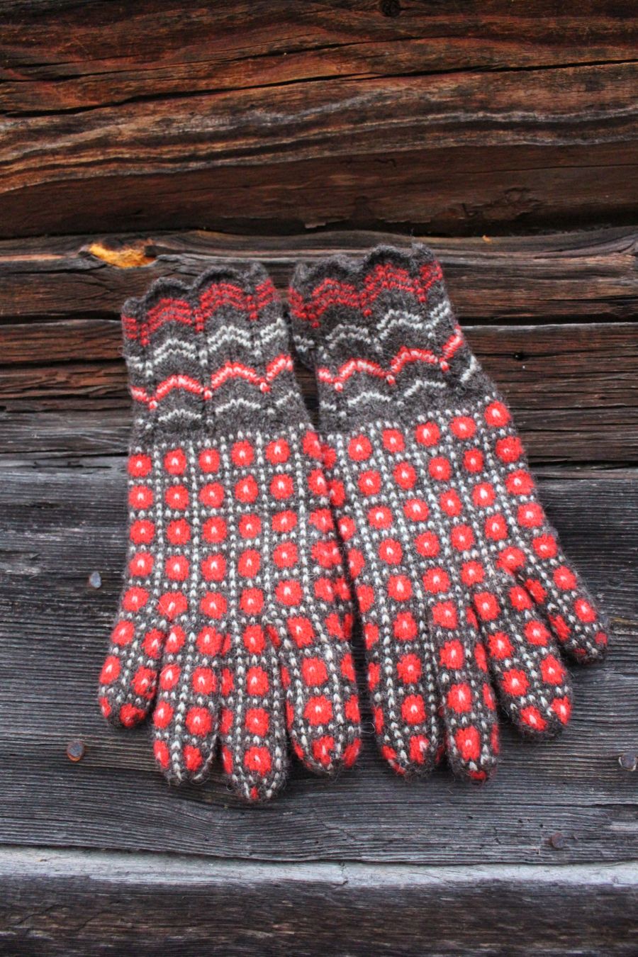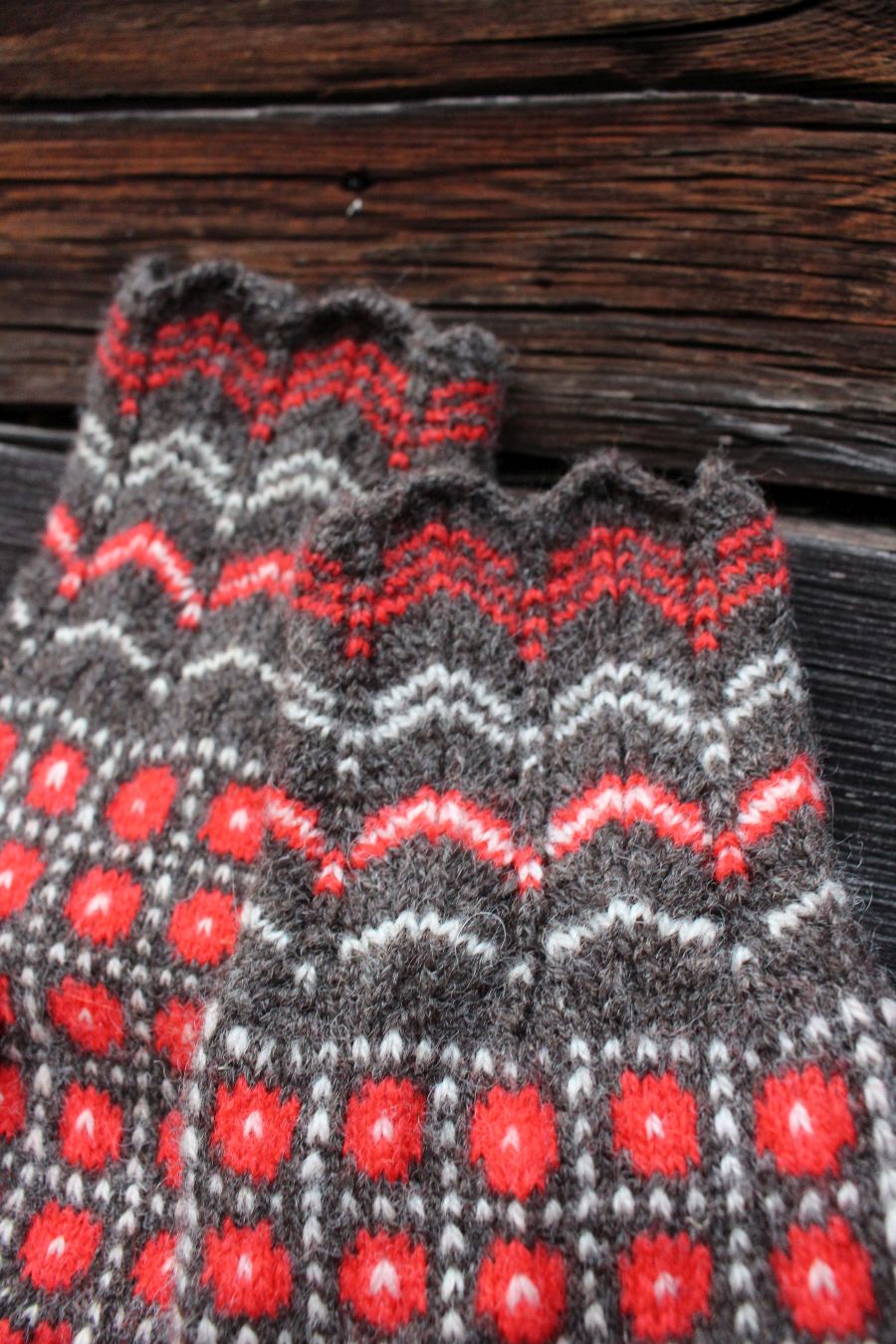 Tightly knitted using 0-size needles and DK weight yarn. The red yarn is hand dyed, 100% wool from Estonia. The off-white and brown yarns are natural sheep color. They come from Kihnu Island. They are perfect to block wind and wear in winter. Beautiful lacy ribbing is very elegant, like a bracelet around your wrist.