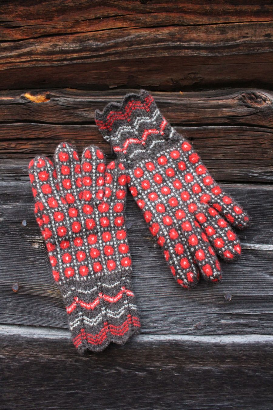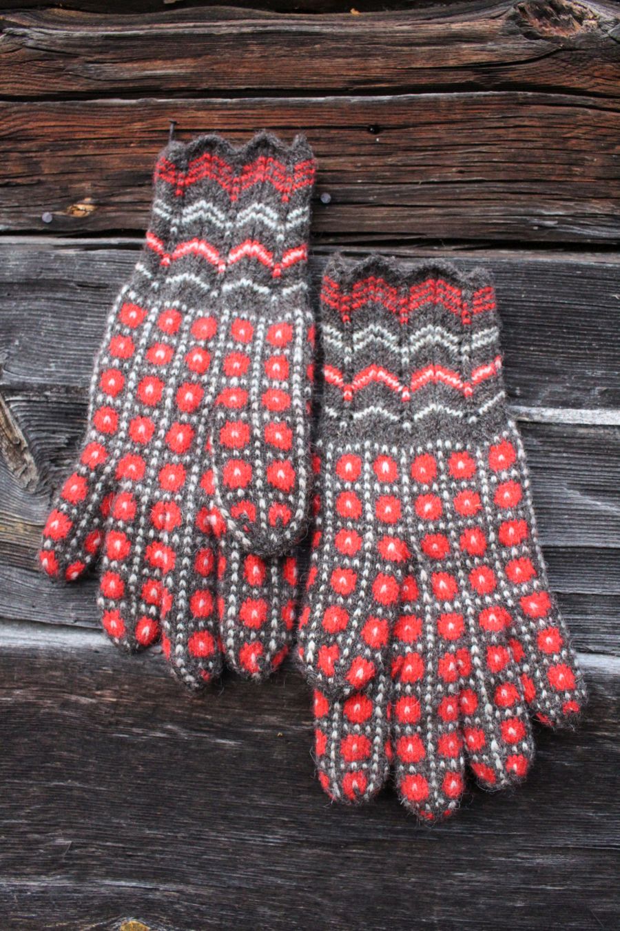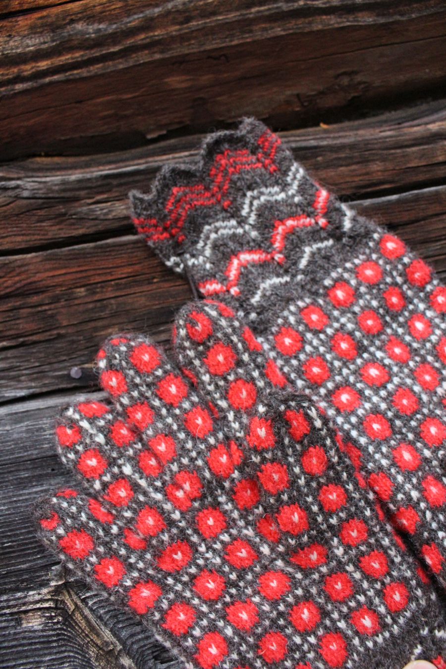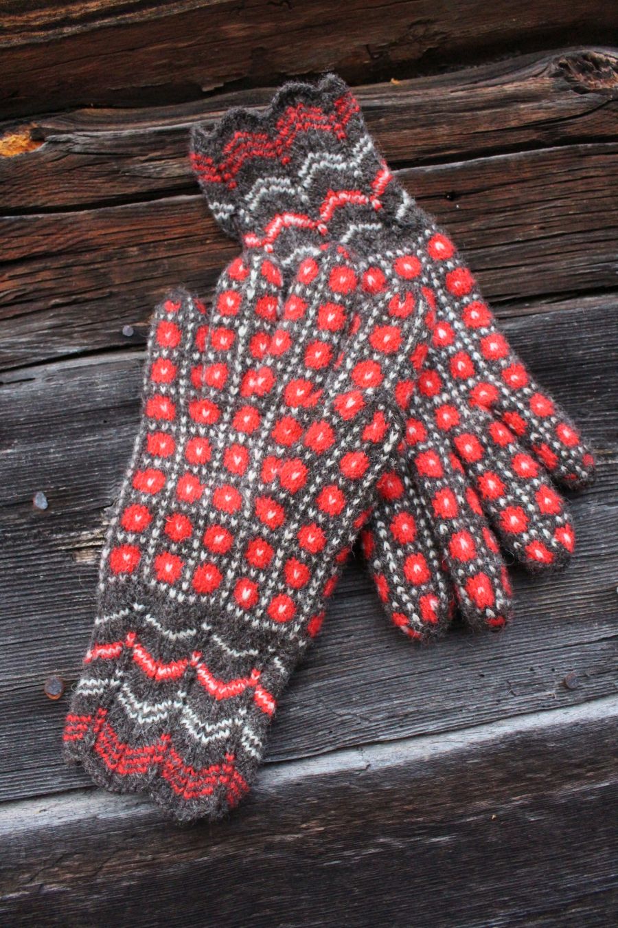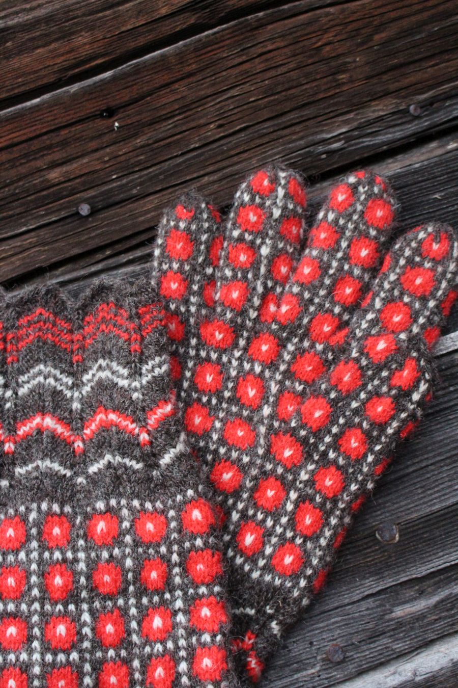 The gloves are color-worked all the way to the fingertips, which makes them warmer than average thin one-layer gloves. The yarn being rather thin makes them very comfortable to wear and they fit like a second skin.