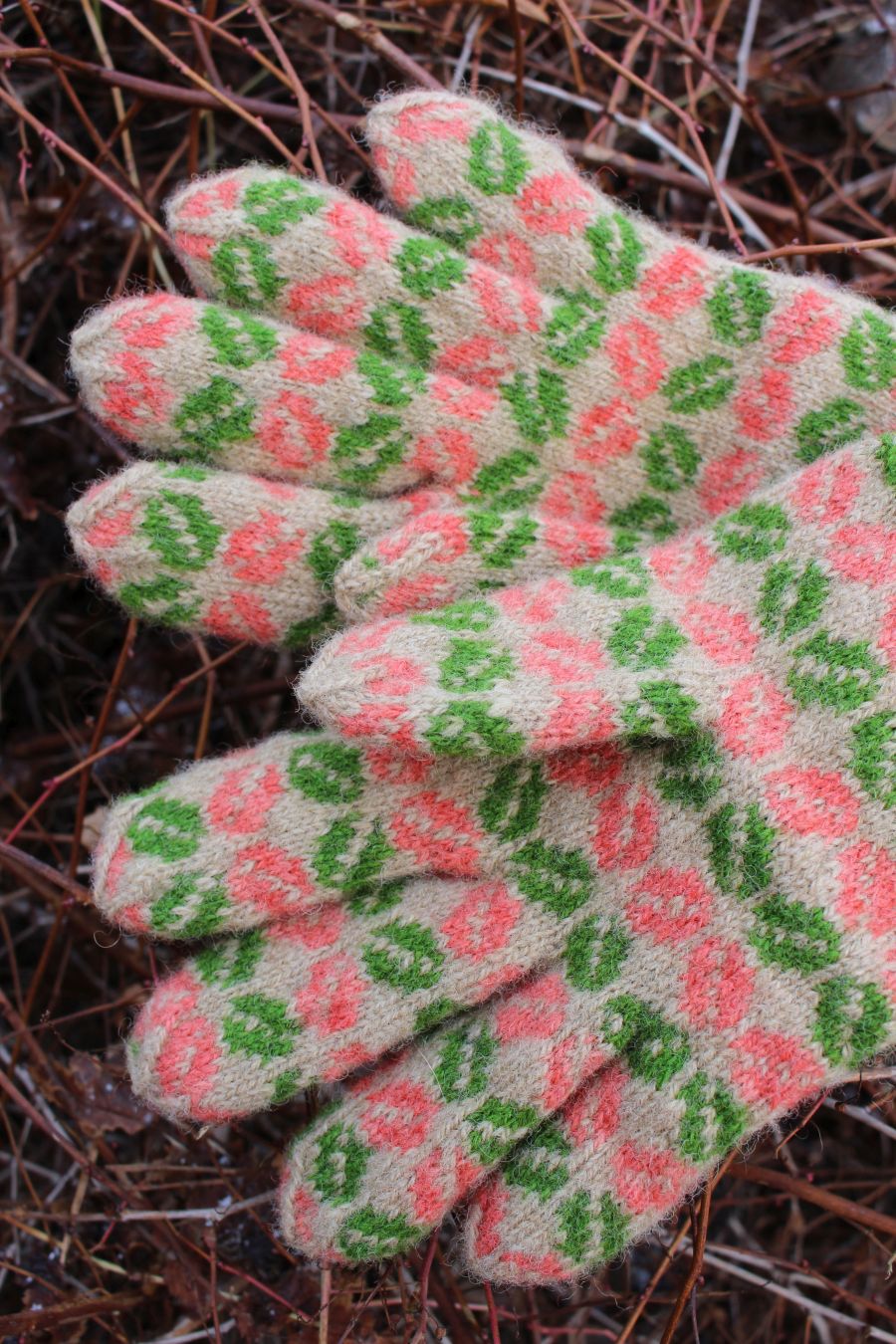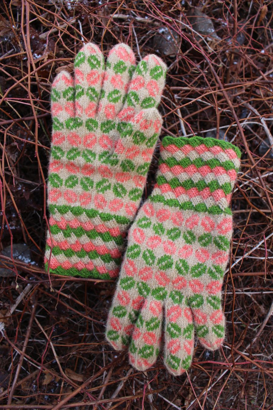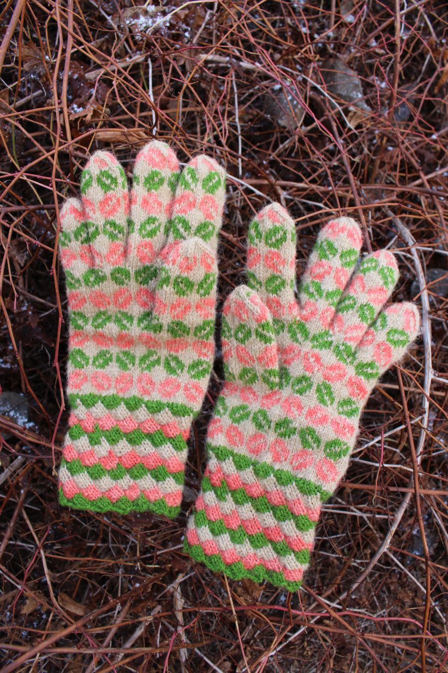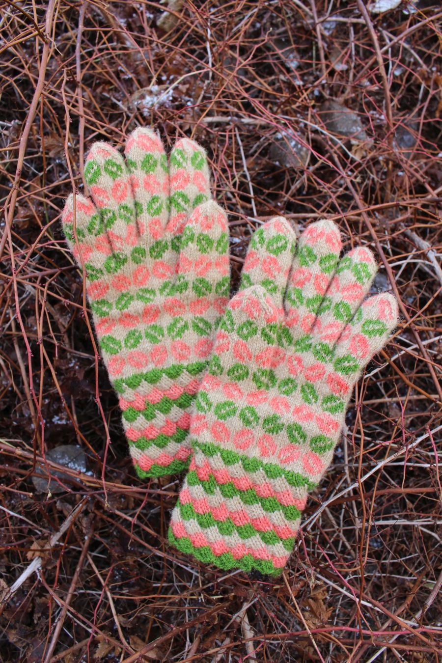 The gloves are color-worked all the way to the fingertips, which makes them warmer than average thin one-layer gloves. The yarn being rather thin makes them very comfortable to wear and they fit like a second skin.