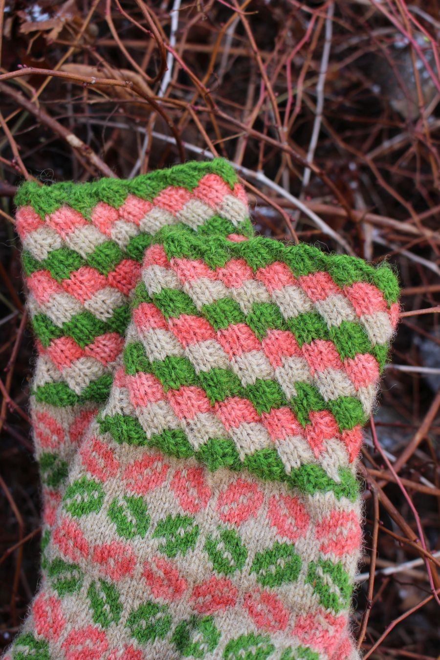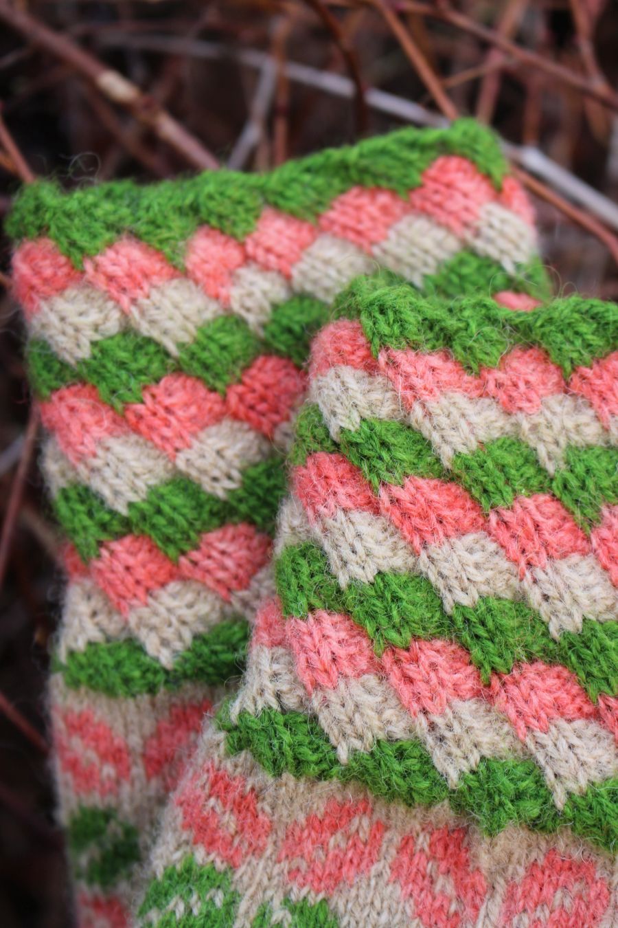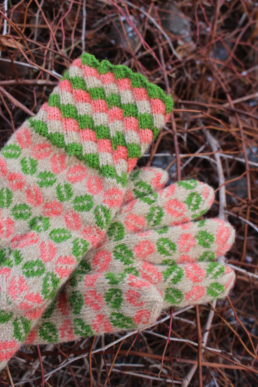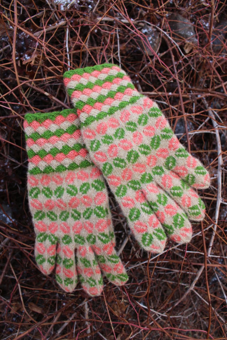 The gloves are color-worked all the way to the fingertips, which makes them warmer than average thin one-layer gloves. The yarn being rather thin makes them very comfortable to wear and they fit like a second skin.