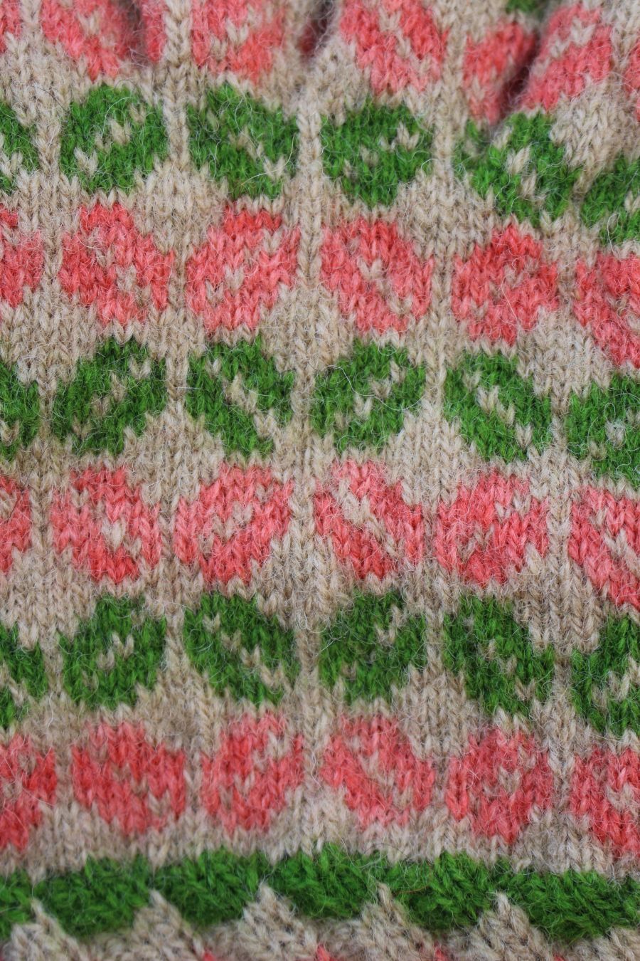 Knitted with mostly three colored yarn in traditional Estonian fair-isle style. The pattern comes from Rapla area, ESTONIA . It is called a Bean Leaf Pattern.